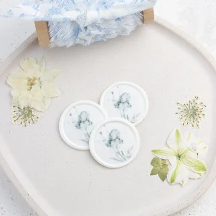 Hand-made white watercolor magnolia wax seals for wedding invitations and stationery pieces.